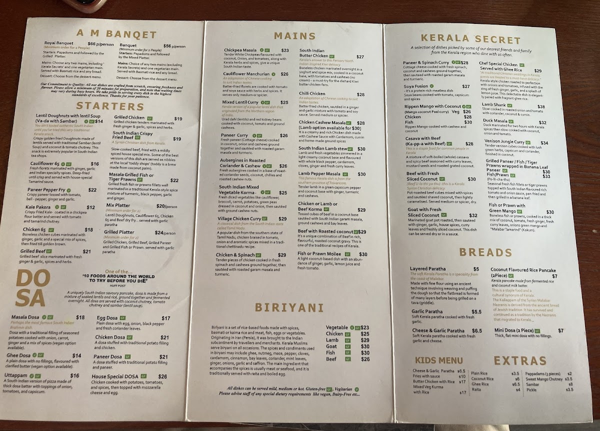 Vegetarian. Tender white chickpeas flavoured with coconut, onion, and tomatoes, along with Kerala herbs and spices, give a unique south Indian taste.