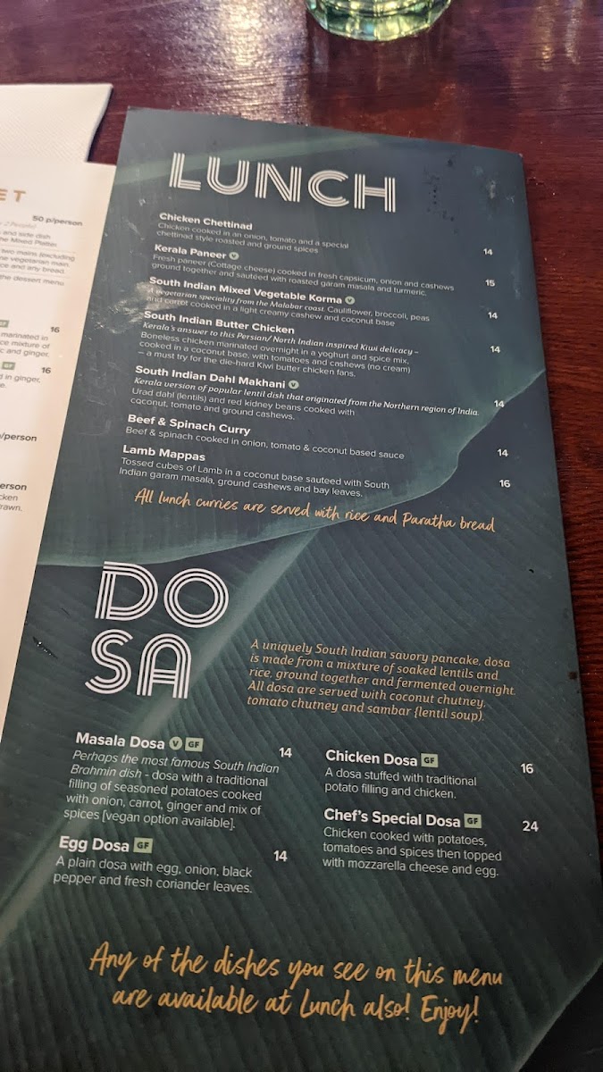 Gluten free. Chicken cooked with potatoes, tomatoes and spices then topped with mozzarella cheese and egg. A south Indian pancake, dosa is made from a mixture of soaked lentils and rice, ground together and fermented overnight. Served with coconut chutney, tomato chutney and sambar (lentil soup).