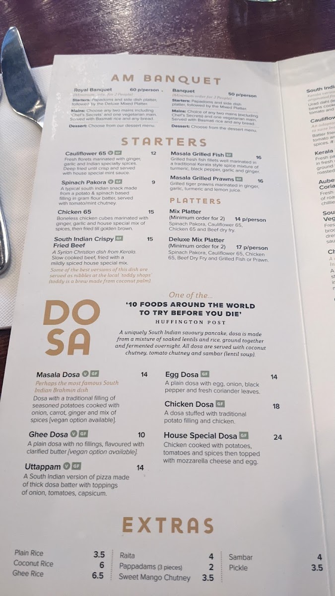 Gluten free, vegetarian. Perhaps the south Indian brahmin dish. Dosa with a filling of seasoned potatoes cooked with onion, carrot, ginger and mix of spices. A south Indian pancake, dosa is made from a mixture of soaked lentils and rice, ground together and fermented overnight. Served with coconut chutney, tomato chutney and sambar (lentil soup). Can be vegan on request.