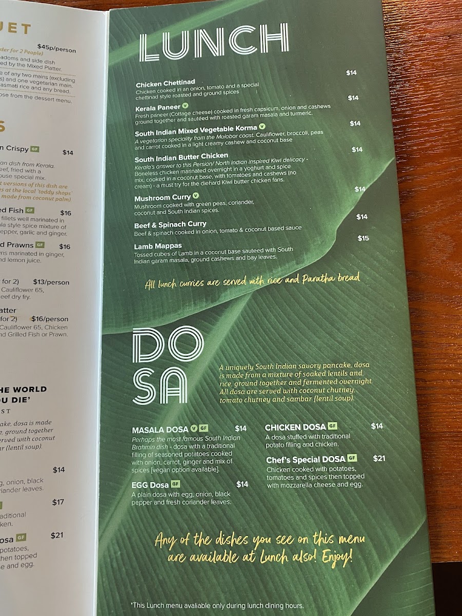 Gluten free, vegetarian. A south Indian version of pizza made of thick dosa batter with toppings of onion, tomatoes and capsicum. A south Indian pancake, dosa is made from a mixture of soaked lentils and rice, ground together and fermented overnight. Served with coconut chutney, tomato chutney and sambar (lentil soup). Can be vegan on request.
